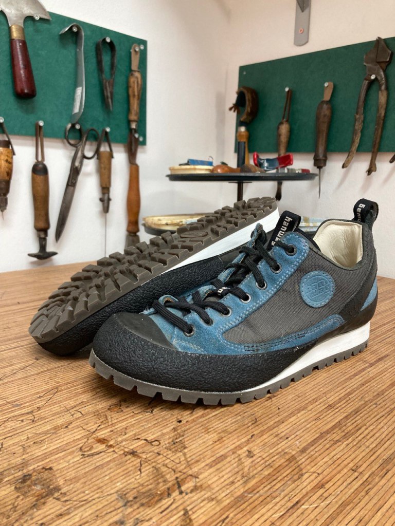 Hier ist immer eine individuelle Betrachtung der Schuhe nötig. Über die Erneuerung des Geröllschutzes oder der Laufsohlen ist vieles möglich. Auch können die Wanderschuhe durch eine Reparatur, wie z.B. einer durchgenähten Leder-Zwischensohle, weiter aufgewertet werden.